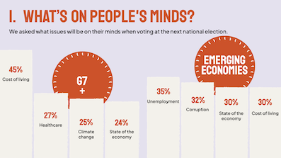 Quels sont les enjeux qui préoccupent le plus les individus ? Dans les pays du G7+, le coût de la vie est la principale inquiétude des personnes interrogées : 45 % d’entre elles ont déclaré que leur vote lors de la prochaine élection nationale sera influencé par cet enjeu. Parmi les préoccupations sélectionnées, figurent ensuite les soins de santé (27 %), les changements climatiques (25 %) et la situation économique du pays  (24 %). Dans les pays émergents, ces résultats varient de manière significative : la principale préoccupation identifiée par les individus est le chômage (35 %), suivie par la corruption (32 %), la situation économique du pays et le coût de la vie (30 % chacune).