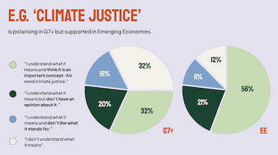 En fonction des pays, la compréhension du vocabulaire utilisé dans les communications ciblant le grand public en matière de climat diffère largement selon les pays. À titre d’exemple, 56 % des personnes interrogées déclarent connaître et soutenir le concept de «  justice climatique  » dans les économies émergentes. Cette proportion tombe à 32 % dans les pays du G7+, c’est-à-dire autant que la proportion de personnes qui déclarent ne pas connaître cette terminologie.