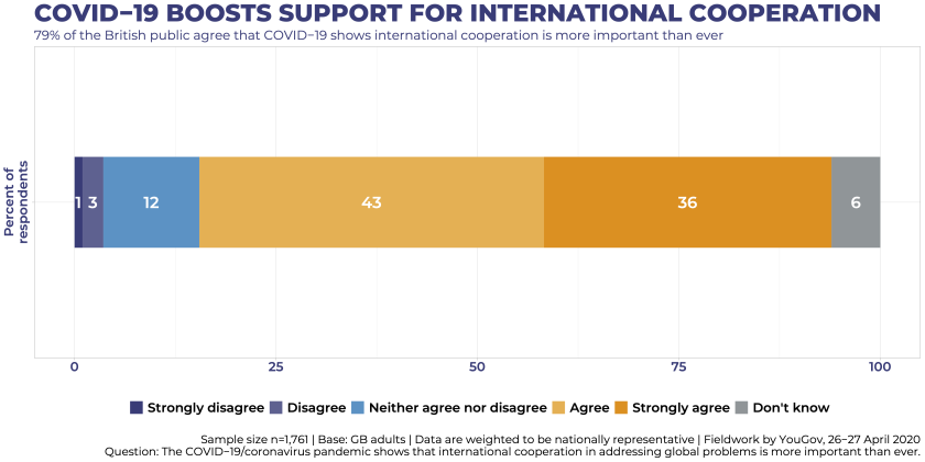 Fort du constat que tant que l’épidémie de Covid-19 continuera de circuler dans un pays le reste du monde ne sera pas en sécurité, 79% des britanniques considèrent que la crise actuelle illustre plus que jamais la nécessité d’une coopération internationale.