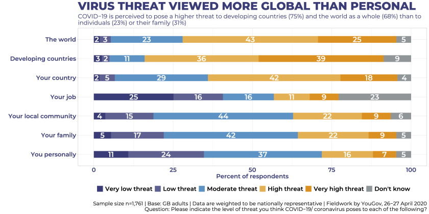 S’il semble logique que chacun s’inquiète pour ses proches et pour soi dans une crise comme celle que nous connaissons, les Britanniques semblent conscients que la menace pèse tout autant sur leur pays (60%) que sur le reste du monde (68%), et considèrent la menace plus importante encore pour les pays en voie de développement (75%), comme le révèle le graphique ci-dessous.
