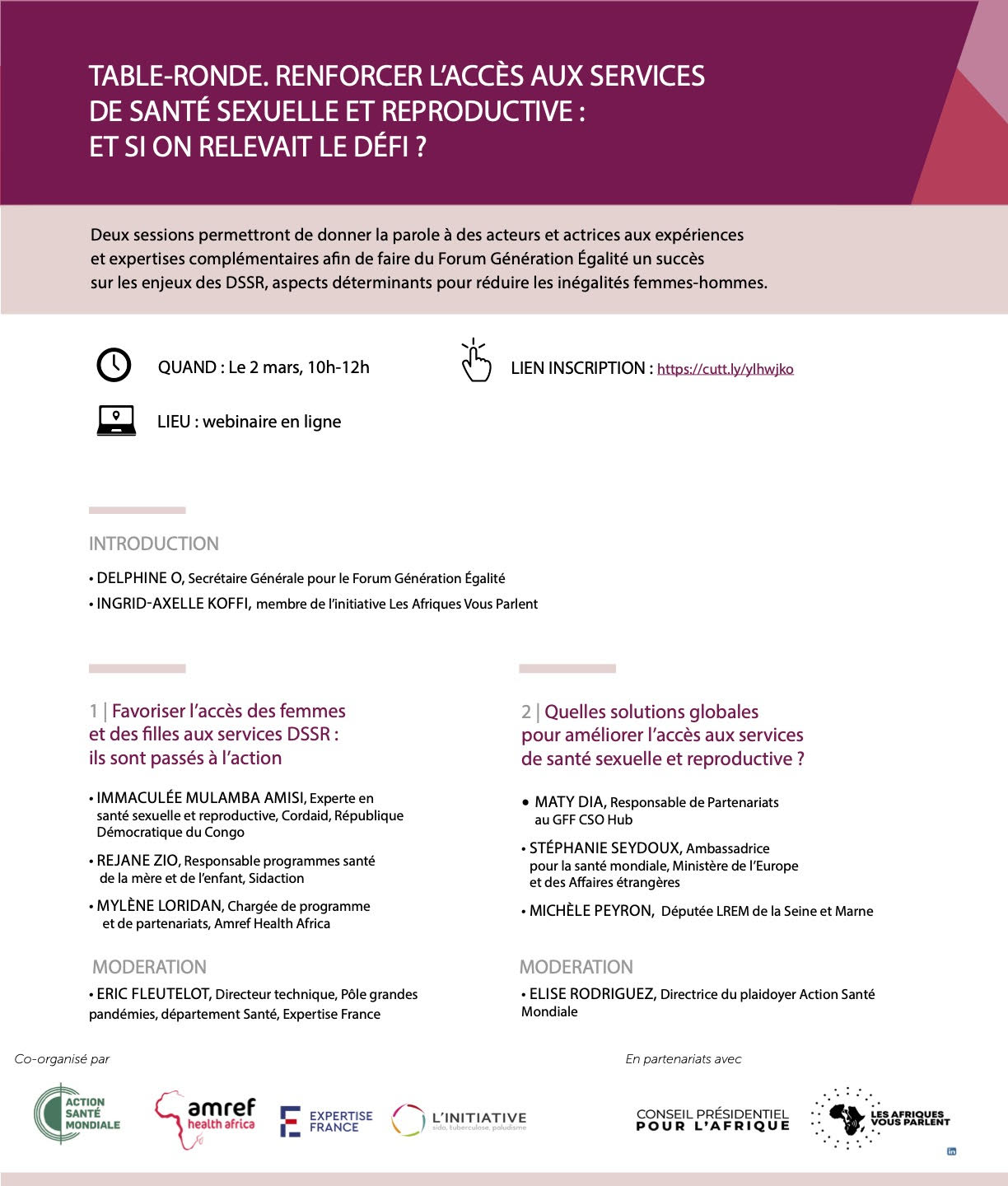 - Organisation d’une table ronde : « Renforcer l’accès aux services de santé sexuelle et reproductive, et si on relevait le défi ? », replay de la table ronde à retrouver sur le site d’Action Santé Mondiale ici.