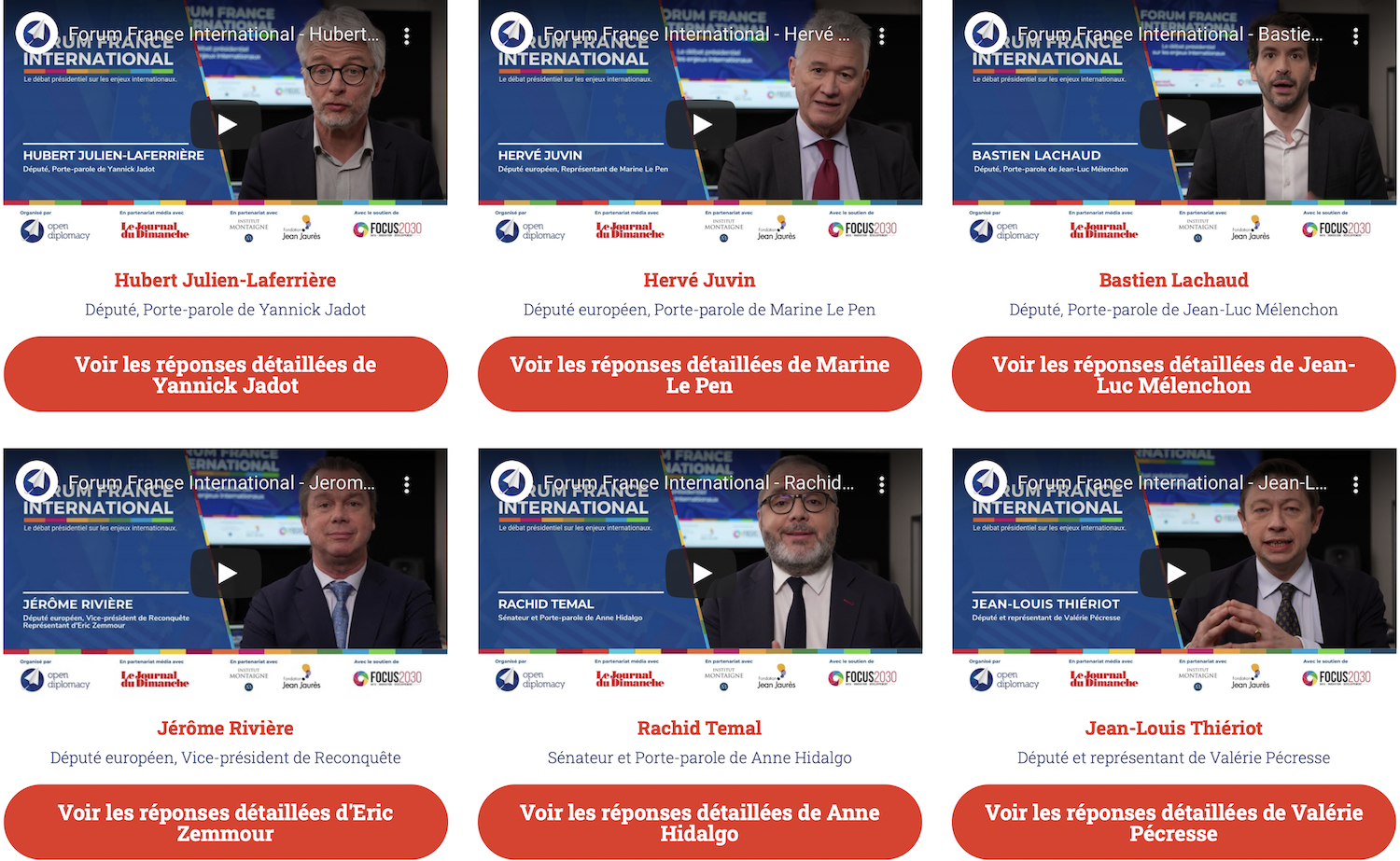 Des interviews vidéos des porte-paroles ayant représenté les principaux candidats à l’élection présidentielle et des expert·es chargés de l’analyse de leurs interventions sont accessibles sur le site de l’Institut Open Diplomacy.