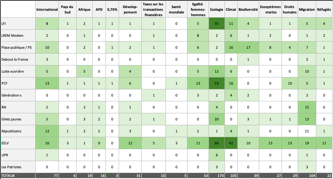 Nous avons à ce titre réalisé une nouvelle recherche pour recenser, dans 13 des programmes des listes en tête aux élections européennes, les mots-clefs suivants : International, pays du Sud, Afrique, APD (aide publique au développement), 0,7%, développement, taxe sur les transactions financières (TTF), santé mondiale, égalité femmes-hommes, écologie, climat, biodiversité, écosystème marins, droits humains, migration, réfugiés.