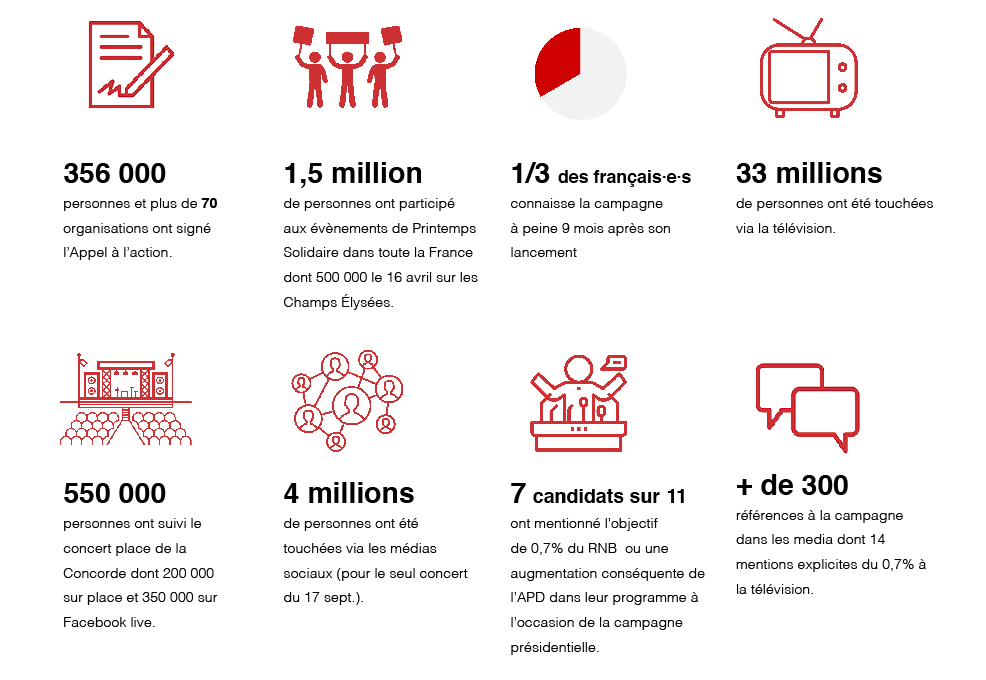 Il ne restait qu’à démontrer publiquement ce soutien dans une période chargée médiatiquement et encombrée socialement et politiquement. Cette campagne à 360° et innovante a permis de mobiliser une toute nouvelle communauté grâce à un dispositif sans précédent et une couverture médiatique hors pair : appel à l’action signé tout au long de l’année par 350 000 signataires, conférences-débats, meetings-concerts historiques, et une conférence internationale où acteurs de la société civile, penseurs, leaders d’opinion, entrepreneurs et artistes ont pris la parole tels que Bill et Melinda Gates, Nicolas Hulot, Ndaba Mandala, Archive, -M- et bien d’autres encore.